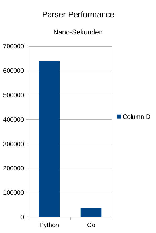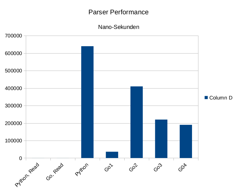 Sowohl Go als auch Python lesen diese kleine Datei in deutlich weniger als 1 ms ein. Das gilt auch, wenn alle Linux-Caches geleert werden. Der Parser benötigt demgegenüber ein Vielfaches an Zeit, so daß bei der Gegenüberstellung nur die reine Parser-Zeit berücksichtigt wird.